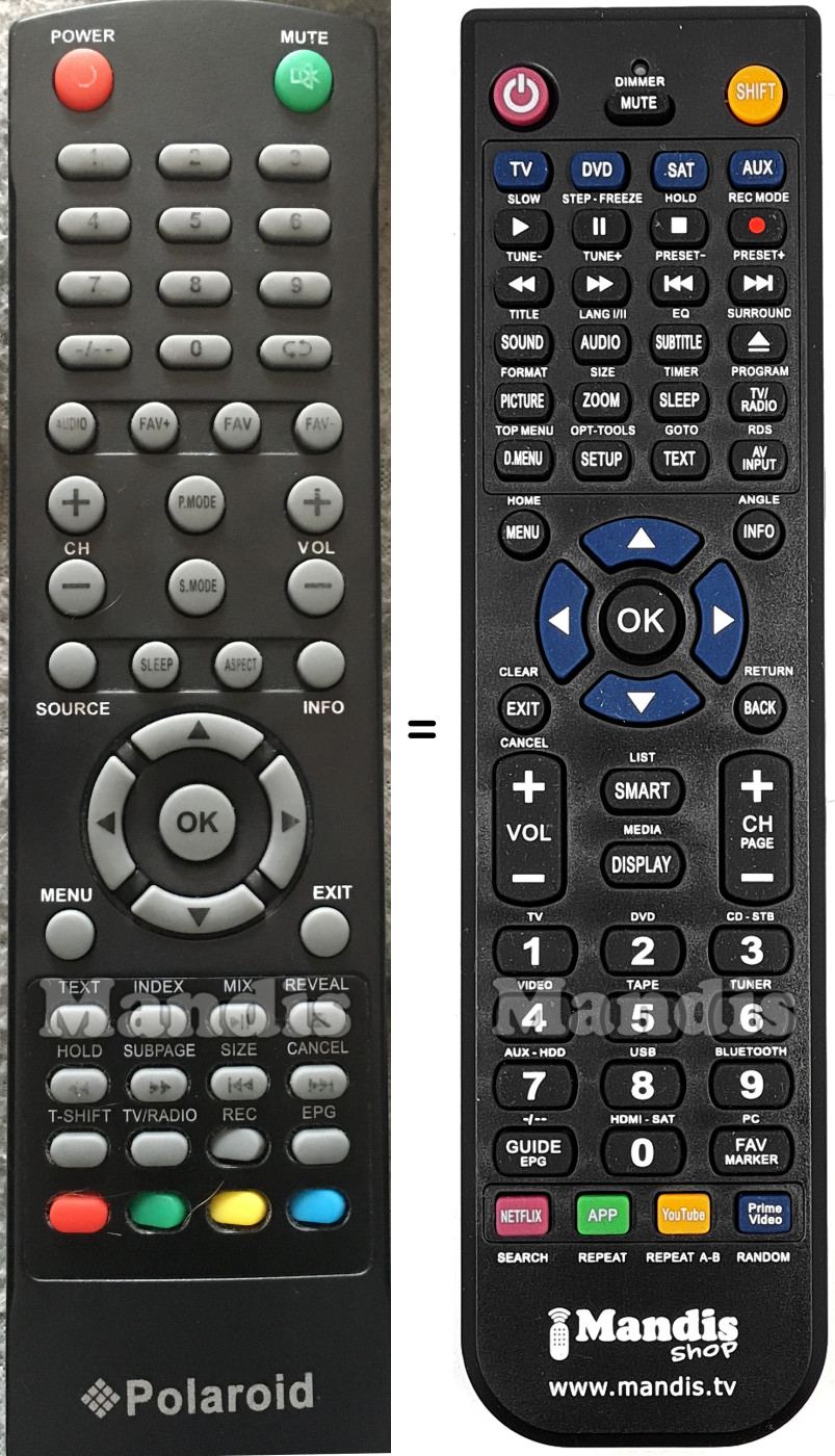 Below, we will show you the correspondence between each button on the original remote control and the button that performs the same function on the replacement remote control. In some cases, you may need to press the SHIFT key before pressing another button to perform certain actions. These additional functions are often not widely used and are included to facilitate understanding of the replacement remote control, or because the original remote control has more buttons than its equivalent.