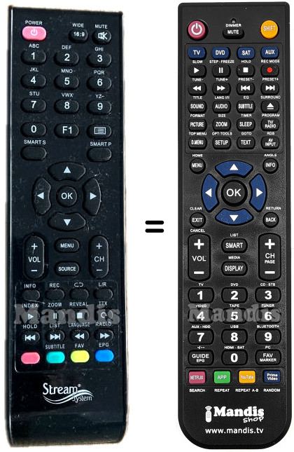 Below, we will show you the correspondence between each button on the original remote control and the button that performs the same function on the replacement remote control. In some cases, you may need to press the SHIFT key before pressing another button to perform certain actions. These additional functions are often not widely used and are included to facilitate understanding of the replacement remote control, or because the original remote control has more buttons than its equivalent.