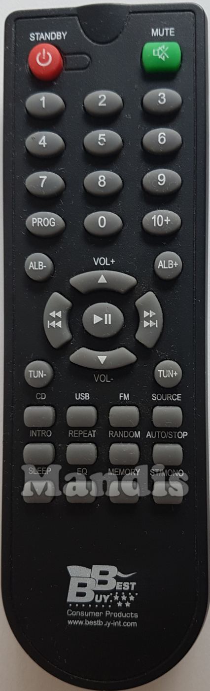 Standby, Mute, 1, 2, 3, 4, 5, 6, 7, 8, 9, 0, 10+, Prog, ALB -, ALB +, Up / Vol +, Down / Vol -, << / I<<, >> / >>I, Play / Pause, TUN -, TUN +, CD, USB, FM, Source, Intro, Repeat, Random, Auto / Stop, Sleep, EQ, Memory, ST / Mono