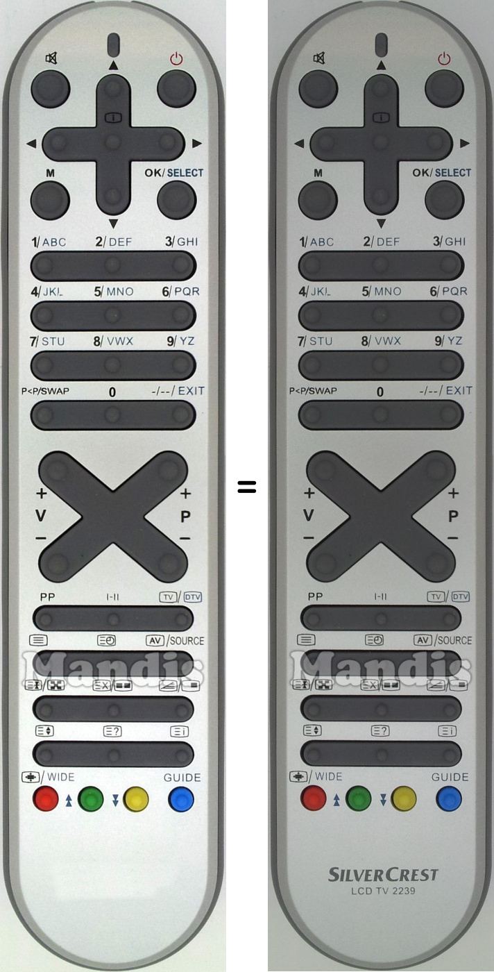 This remote control has the following buttons: Mute, Power, M, OK/Select, Up, Down, Right, Left, [i], 1, 2, 3, 4, 5, 6, 7, 8, 9, 0, P<P/Swap, -/--/ Exit, Vol+, Vol-, P+, P-, PP, I-II, Tv/DTV, [=], [=O], AV/Source, [=+]/[X], [=X]/[▪▪], [.=]/[ ▪], [=♦], [=?], [=i], Red/[+]/Wide/↑, Green/↓, Yellow, Blue/Guide