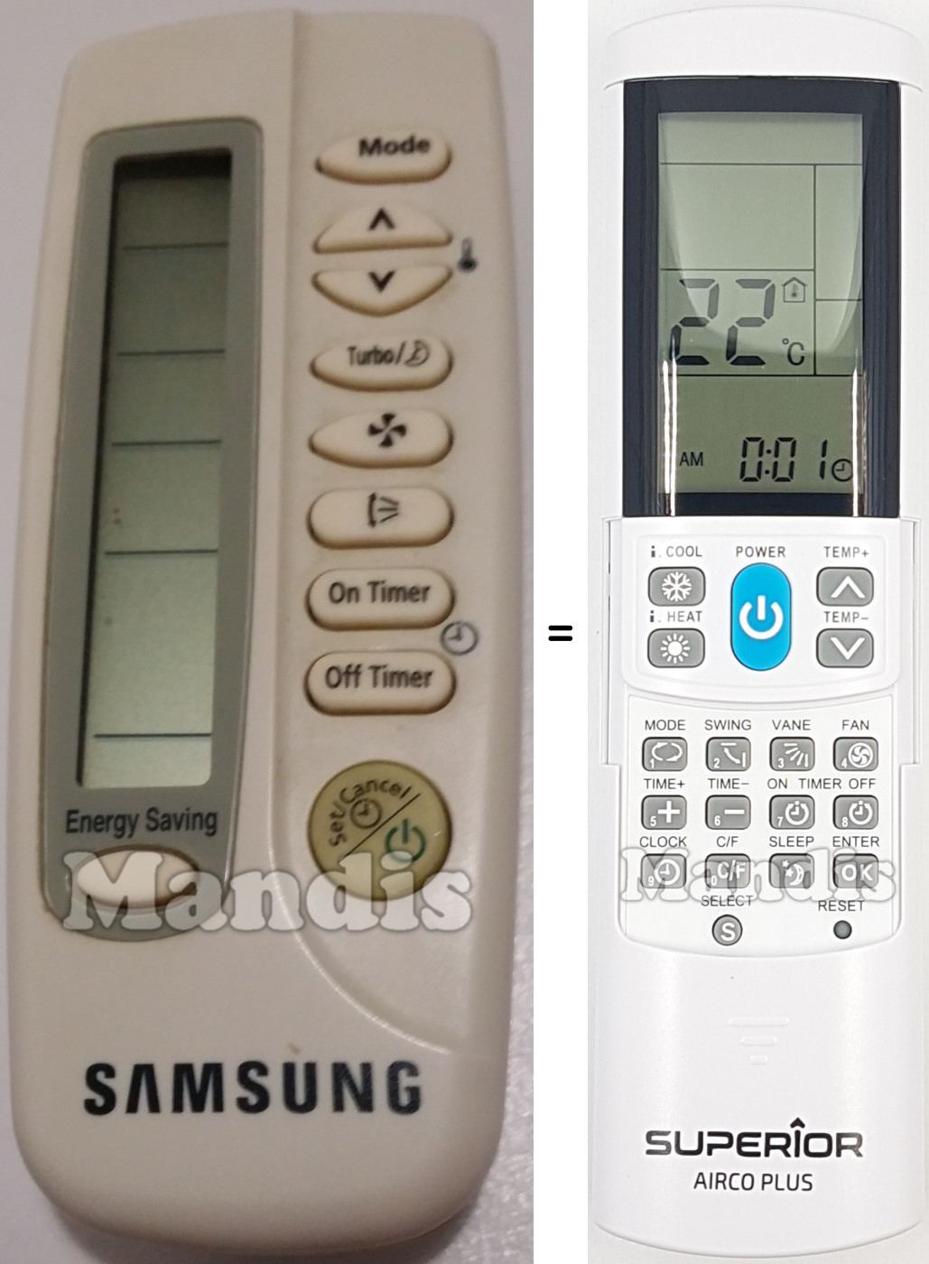 My LG air-conditioner's remote died and need replacement. AircoPlus did the job. I should point out that the code match did not correspond according to manufacturer's table. Let the auto-search code set up do the work. Also, excellent service by Mandis Remotes with a well-protected package.