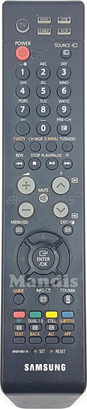 TV, DVD, STB, CABLE, VCR, Power, Source, 1, 2, 3, 4, 5, 6, 7, 8, 9, 0, -/--, Pre-Ch, TV / DTV, CH. Mgr., D.Menu, TV / Radio, << REW, Stop, Play / Pause, FF >>, Vol +, Vol -, Mute, P +, P -, Menu, Exit, Up, Right, Down, Left, Enter / OK, Guide, Info, TTX / Mix, Red, Green, Yellow, Blue, PIP, Dual I-II, Still, Subtitle, Text, Back, Alt, APP