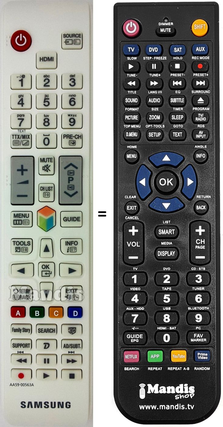 Remote control to replace the original AA59-00563A and all its functions. It is not a universal remote but a substitute for the original. You will receive the remote ready to use: you only need to install the batteries. It is not necessary to program it. We offer you our full guarantee that the remote will fulfil all the functions of the original.