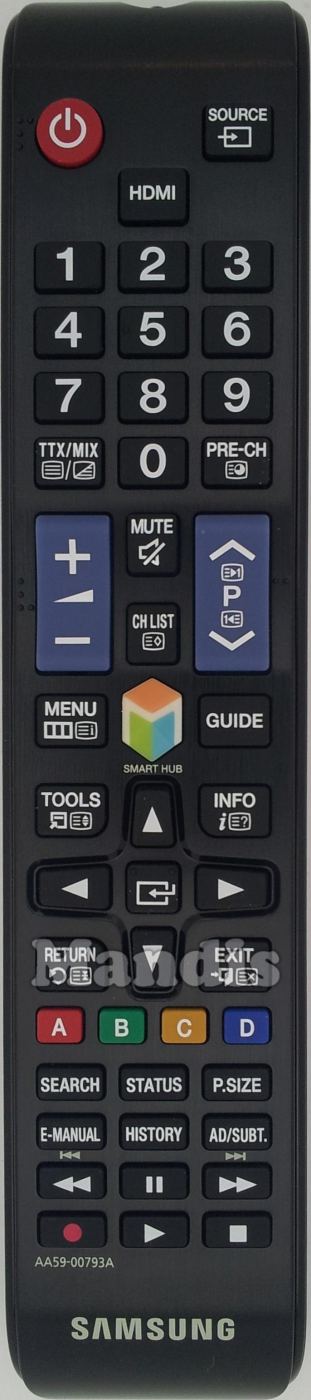 power, source, hdmi, 1, 2, 3, 4, 5, 6, 7, 8, 9, 0, ttx/mix, pre-ch, vol+, vol-, pr+, pr-, mute, ch list, smart hub, menu, guide, tools, info, return, exit, enter, up, down, right, left, red, green , yellow, blue, search, status, p.size, e-manual, history , ad/subt., <<, pause, >>, rec, play, stop