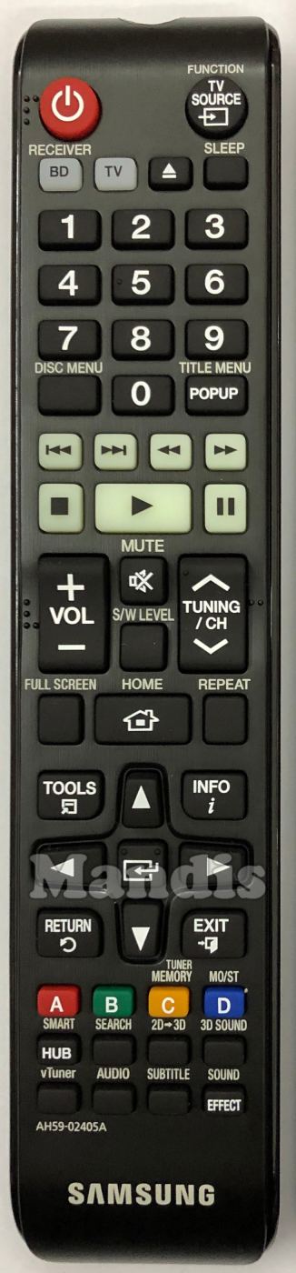 Power, TV Source / Function, BD / Receiver, TV, Eject, Sleep, 1, 2, 3, 4, 5, 6, 7, 8, 9, 0, Disc Menu, Popup / Title Menu, I<<, >>I, <<, >>, Stop, Play, Pause, Vol +, Vol -, Mute, S/W Level, Tuning + / CH +, Tning - / CH -, Full Screen, Home, Repeat, Tools, Info, Up, Down, Right, Left, Enter, Return, Exit, Red, Green, Yellow / Tuner Memoty, Blue, Smart HUB, Search, 2D --> 3D, 3d Sound, vTuner, Audio, Subtitle, Effect / Sound