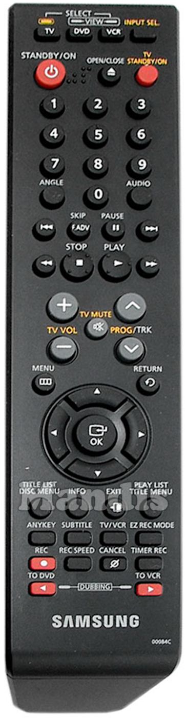 Standby / On, TV, DVD, VCR, Input Sel, Open / Close, TV Standby / On, 1, 2, 3, 4, 5, 6, 7, 8, 9, 0, Angle, Audio, I<<, F.Adv / Skip, Pause, >>I, <<, Stop, Play, >>, TV Vol+, TV Vol-, Mute / TV Mute, Prog/TRK+, Prog/TRK-, Menu, Return, Up, Left, OK, Right, Down, Title List / Disc Menu, Info, Exit, Play List / Title Menu, Anykey, Subtitle, TV/VCR, EZ Rec Mode, Rec, Rec Speed, Cancel, Timer Rec, Dubbing To DVD, Dubbing To VCR