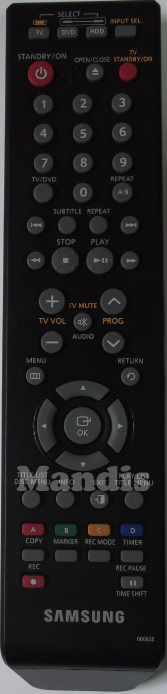 Standby/on, Input Sel, Open/Close, Tv Standby/On, 1, 2, 3, 4, 5, 6, 7, 8, 9, Tv/DVD, 0, A-B Repeat, Repeat, Subtitle, I<<, >>I, <<, >>, Stop, Play/Pause, Tv Vol+, Tv Vol-, Prog+, Prog-, Audio/Tv Mute, Menu, Return, Up, Down, Right, Left, OK, Title List/Disc Menu, Play List/Title Menu, Exit, Info, Red, Green, Yellow, Blue, Copy, Marker, Rec Mode, Timer, Rec, Rec Pause/Timeshift, DVD, HDD