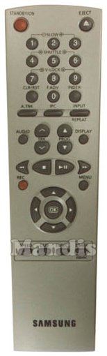 STANDBY/ON, EJECT, 1/SLOW1, 2, 3/SLOW+, 4/SHUTTLE-, 5, 6/SHUTTLE+, 7/V-LOCK-, 8, 9/V-LOCK+, 0, CLR/RST, INDEX, A.TRK, IPC, INPUT/REPEAT, AUDIO, DISPLAY, TRK+, TRK-, PROG+, PROG-, <<, >>, STOP, PLAY/PAUSE, REC, MENU, OK, UP, DOWN, RIGHT, LEFT, SPEED, DUB, TV/VCR, TIMER