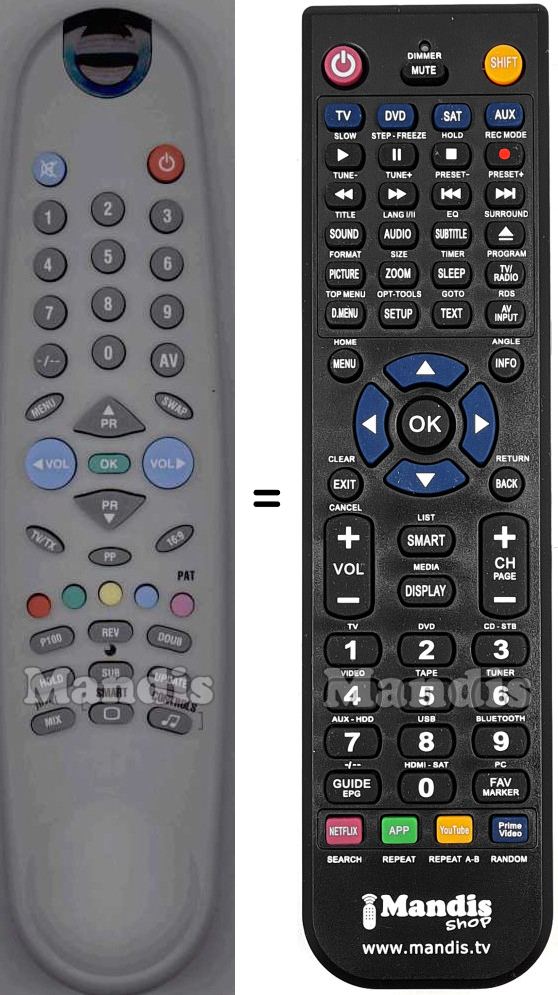 Below, we will show you the correspondence between each button on the original remote control and the button that performs the same function on the replacement remote control. In some cases, you may need to press the SHIFT key before pressing another button to perform certain actions. These additional functions are often not widely used and are included to facilitate understanding of the replacement remote control, or because the original remote control has more buttons than its equivalent.