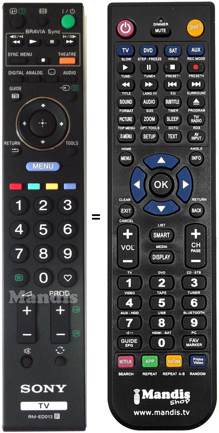 Remote control to replace the original RMED013 (148079811) and all its functions.