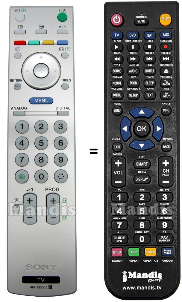 This remote control fully replaces your RM-ED 005 (147968521) and offers all the functions of the original.