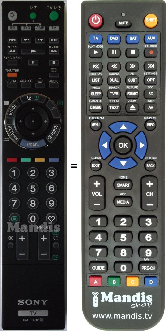 Below, we will show you the correspondence between each button on the original remote control and the button that performs the same function on the replacement remote control. In some cases, you may need to press the SHIFT key before pressing another button to perform certain actions. These additional functions are often not widely used and are included to facilitate understanding of the replacement remote control, or because the original remote control has more buttons than its equivalent.