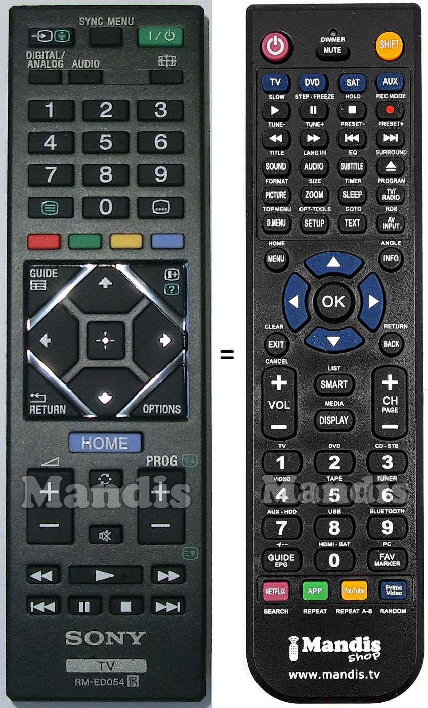 This remote control fully replaces your RM-ED054 (149206721) and offers all the functions of the original.
