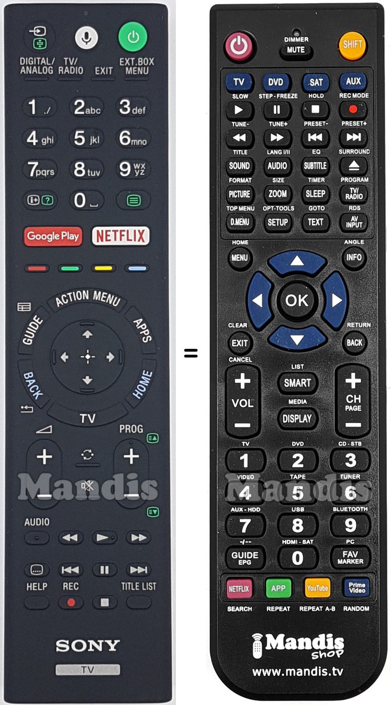 Below, we will show you the correspondence between each button on the original remote control and the button that performs the same function on the replacement remote control. In some cases, you may need to press the SHIFT key before pressing another button to perform certain actions. These additional functions are often not widely used and are included to facilitate understanding of the replacement remote control, or because the original remote control has more buttons than its equivalent.