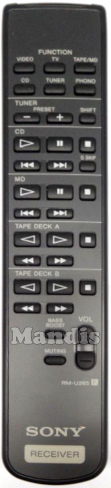 This remote control has the following buttons: Video, TV, Tape / MD, CD, Tuner, Phono, TUNER Preset-, TUNER Preset+, TUNER Shift, CD Play, CD Pause, CD Stop, CD I<<, CD >>I, CD D.Skip, MD Play, MD Pause, MD I<<, MD >>I, MD Stop, TAPE Deck A Rev. Play, TAPE Deck A Play, TAPE Deck A <<, TAPE Deck A >>, TAPE Deck A Stop, TAPE Deck B Rev. Play, TAPE Deck B Play, TAPE Deck B Stop, TAPE Deck B <<, TAPE Deck B >>, Bass Boost, Muting, Vol+, Vol-