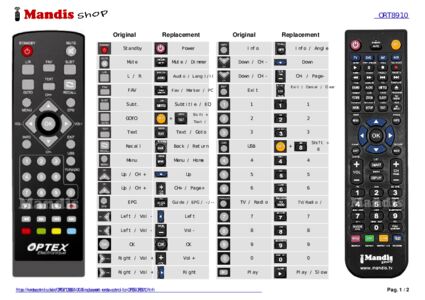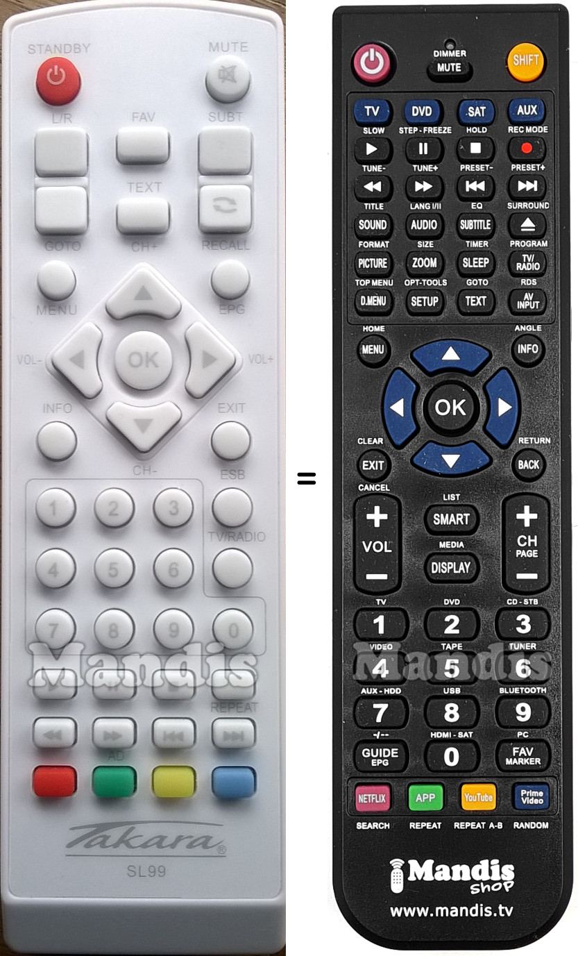 Below, we will show you the correspondence between each button on the original remote control and the button that performs the same function on the replacement remote control. In some cases, you may need to press the SHIFT key before pressing another button to perform certain actions. These additional functions are often not widely used and are included to facilitate understanding of the replacement remote control, or because the original remote control has more buttons than its equivalent.