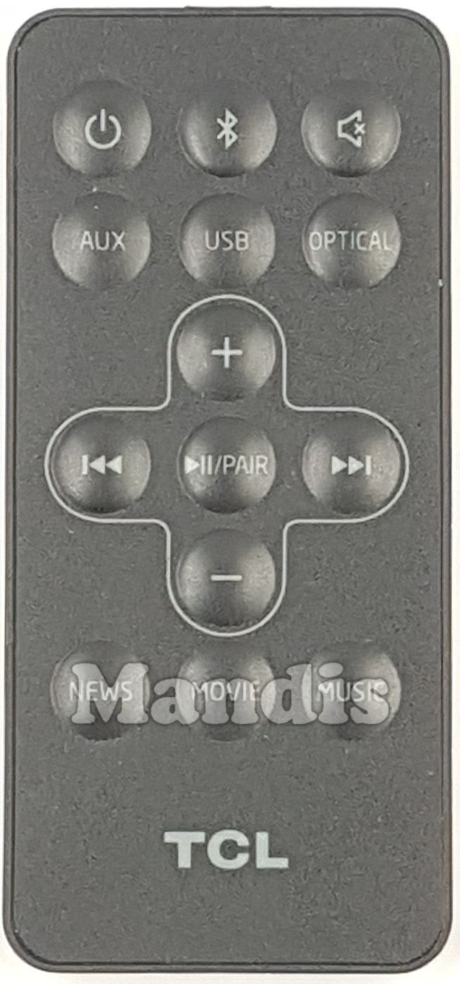 This remote control has the following buttons: Power, Bluetooth, Mute, AUX, USB, Optical, +, -, >>I, I<<, Play/Pause/Pair, News, Movie, Music