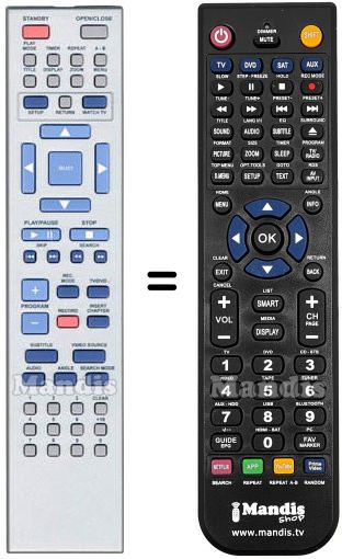 Below, we will show you the correspondence between each button on the original remote control and the button that performs the same function on the replacement remote control. In some cases, you may need to press the SHIFT key before pressing another button to perform certain actions. These additional functions are often not widely used and are included to facilitate understanding of the replacement remote control, or because the original remote control has more buttons than its equivalent.