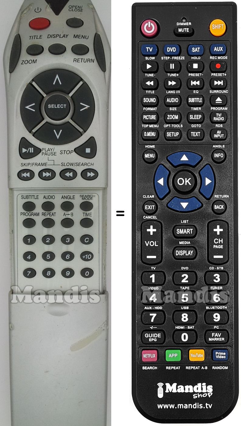 Below, we will show you the correspondence between each button on the original remote control and the button that performs the same function on the replacement remote control. In some cases, you may need to press the SHIFT key before pressing another button to perform certain actions. These additional functions are often not widely used and are included to facilitate understanding of the replacement remote control, or because the original remote control has more buttons than its equivalent.