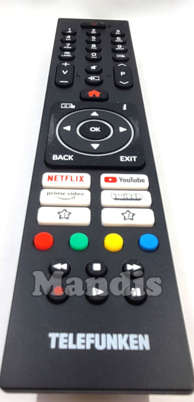 This remote control has the following buttons: Power, 1, 2, 3, 4, 5, 6, 7, 8, 9, 0, Lang, TXT, V+, V-, Mute, Input, P+, P-, Home, Guide, Info, Up, Left, OK, Right, Down, Back, Exit, Netflix, YouTube, Prime Video, Twitch, Fav1, Fav2, Red, Green, Yellow, Blue, <<, Stop, >>, Rec, Play, Pause
