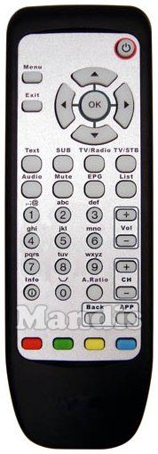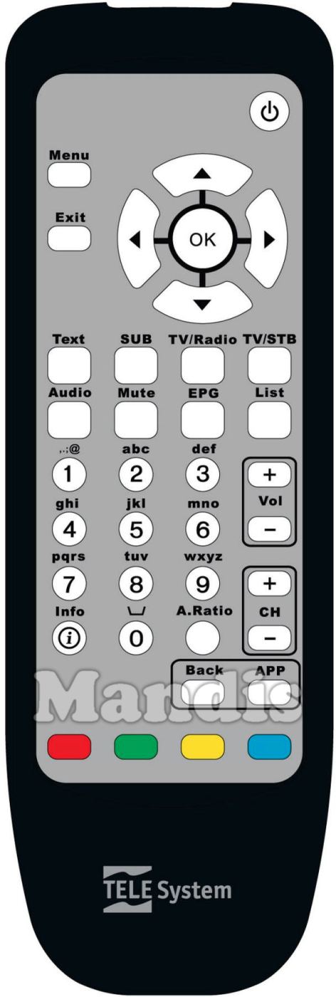 Power, Menu, Exit, Up, Left, OK, Right, Down, Text, SUB, TV / Radio, TV / STB, Audio, Mute, EPG, List, 1, 2, 3, 4, 5, 6, 7, 8, 9, 0, Info, A.Ratio, Vol +, Vol -, CH +, CH -, Back, APP, Red, Green, Yellow, Blue