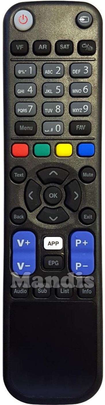 Power, Source, VF, AR, SAT, TV / Radio, 1, 2, 3, 4, 5, 6, 7, 8, 9, 0, Menu, FAV, Red, Green, Yellow, Blue, Text, Mute, Back, Exit, Up, Right, Down, Left, OK, V +, V -, APP, EPG, P +, P -, Audio, Sub, List, Info