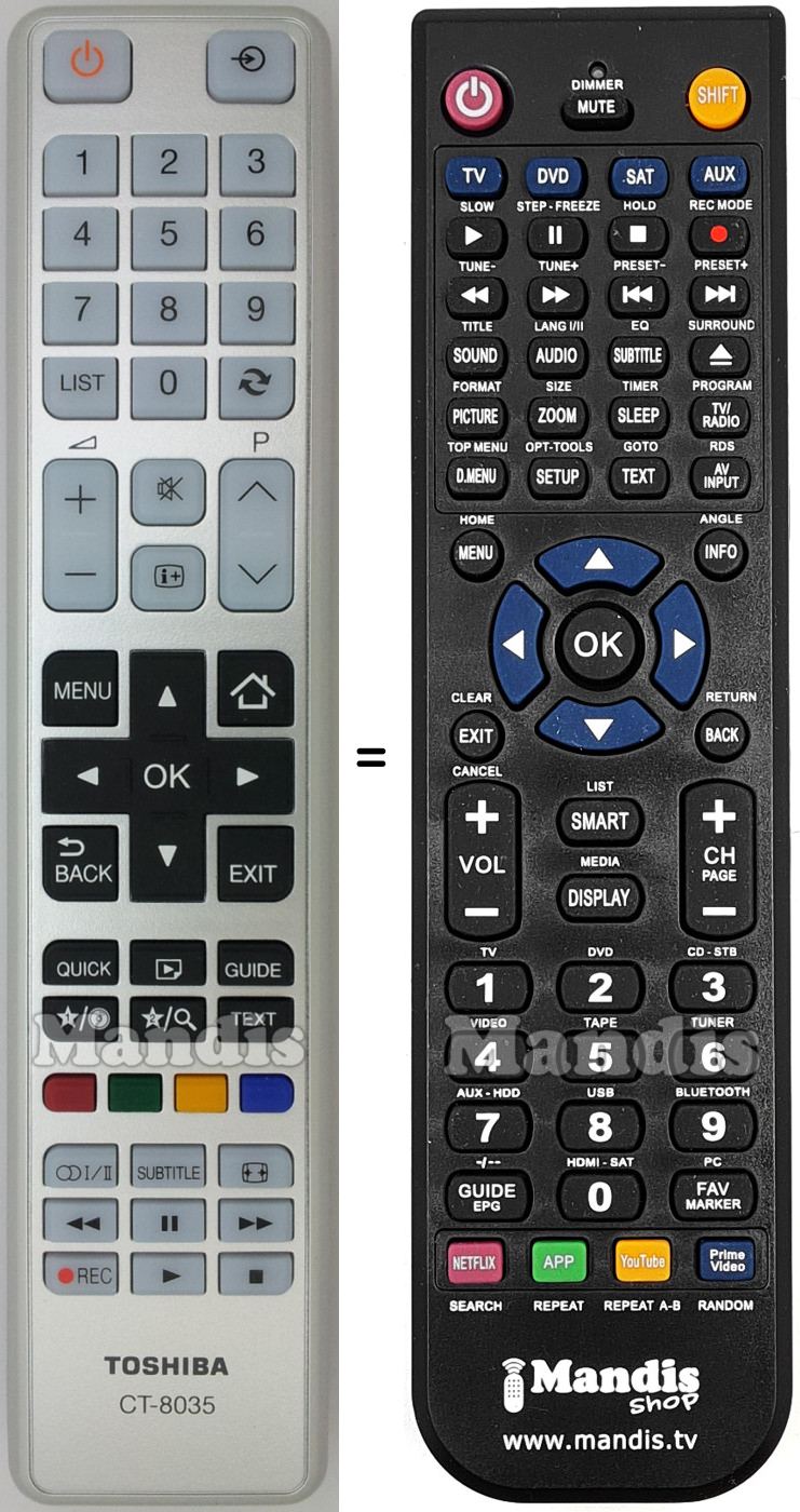 Below, we will show you the correspondence between each button on the original remote control and the button that performs the same function on the replacement remote control. In some cases, you may need to press the SHIFT key before pressing another button to perform certain actions. These additional functions are often not widely used and are included to facilitate understanding of the replacement remote control, or because the original remote control has more buttons than its equivalent.