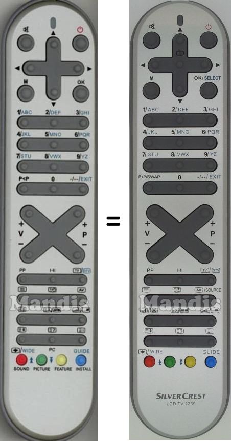 This remote control has the following buttons: Mute, Power, M, OK/Select, Up, Down, Right, Left, [i], 1, 2, 3, 4, 5, 6, 7, 8, 9, 0, P<P/Swap, -/--/ Exit, Vol+, Vol-, P+, P-, PP, I-II, Tv/DTV, [=], [=O], AV/Source, [=+]/[X], [=X]/[▪▪], [.=]/[ ▪], [=♦], [=?], [=i], Red/[+]/Wide/↑, Green/↓, Yellow, Blue/Guide