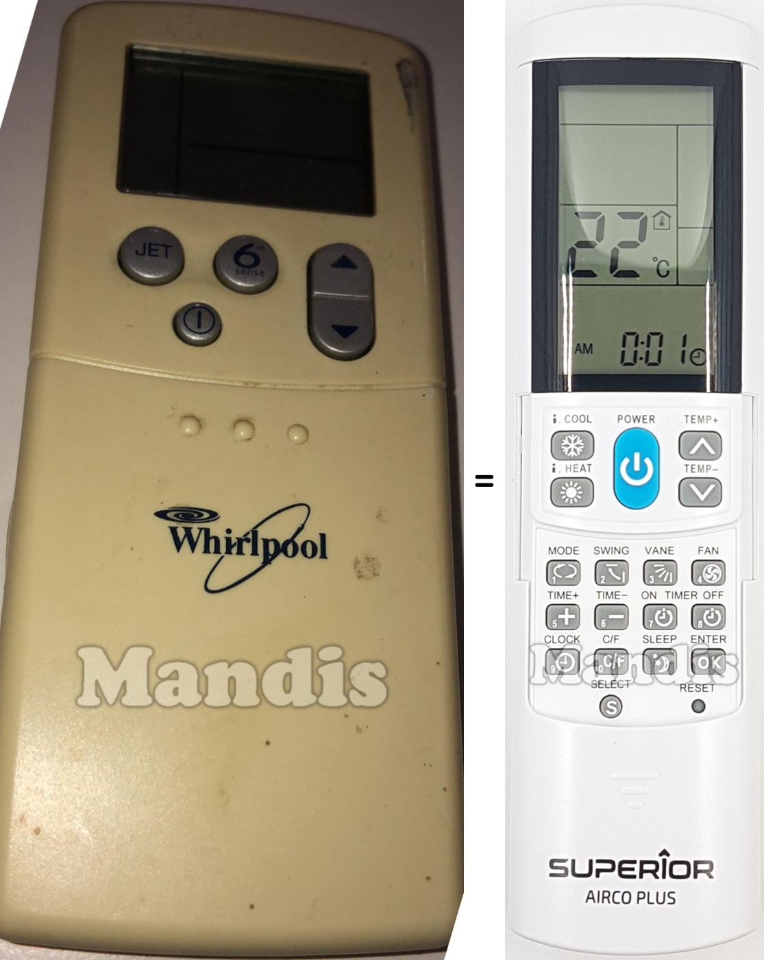 My LG air-conditioner's remote died and need replacement. AircoPlus did the job. I should point out that the code match did not correspond according to manufacturer's table. Let the auto-search code set up do the work. Also, excellent service by Mandis Remotes with a well-protected package.