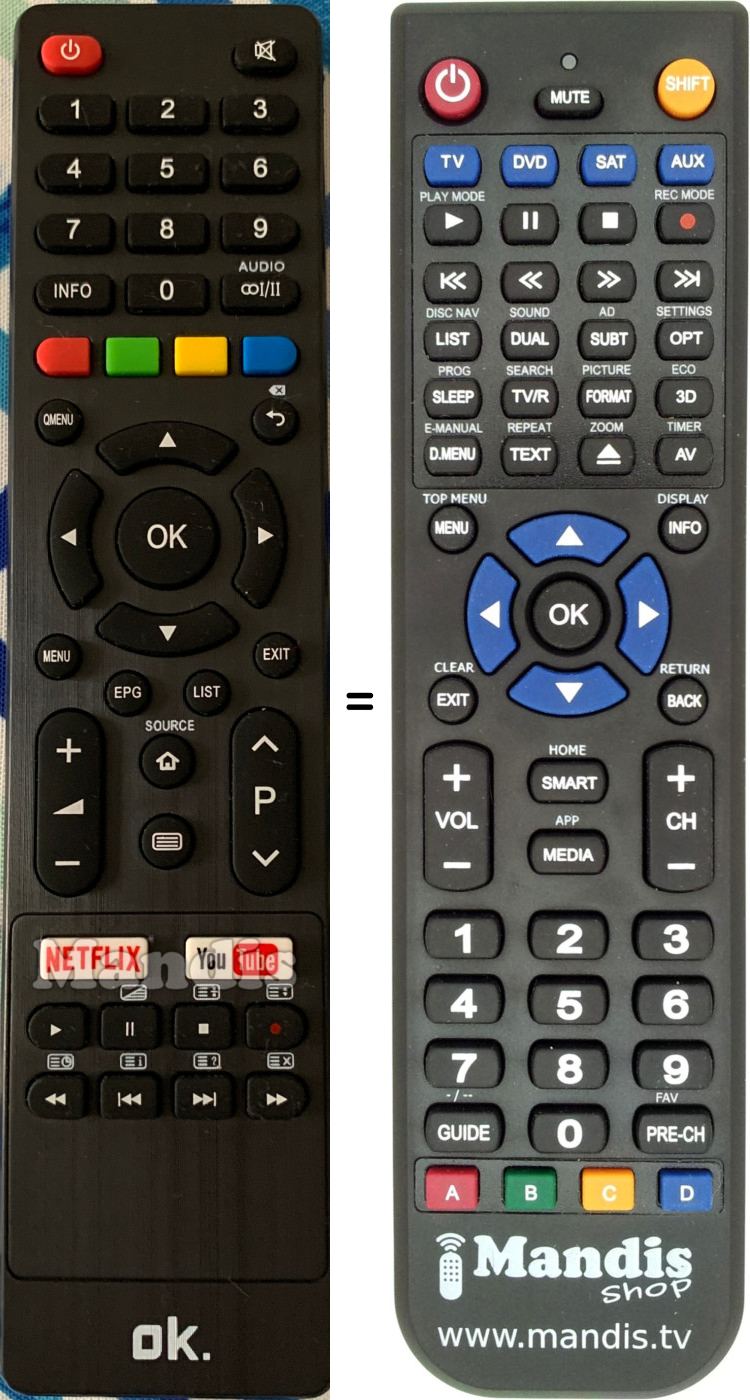 Below, we will show you the correspondence between each button on the original remote control and the button that performs the same function on the replacement remote control. In some cases, you may need to press the SHIFT key before pressing another button to perform certain actions. These additional functions are often not widely used and are included to facilitate understanding of the replacement remote control, or because the original remote control has more buttons than its equivalent.